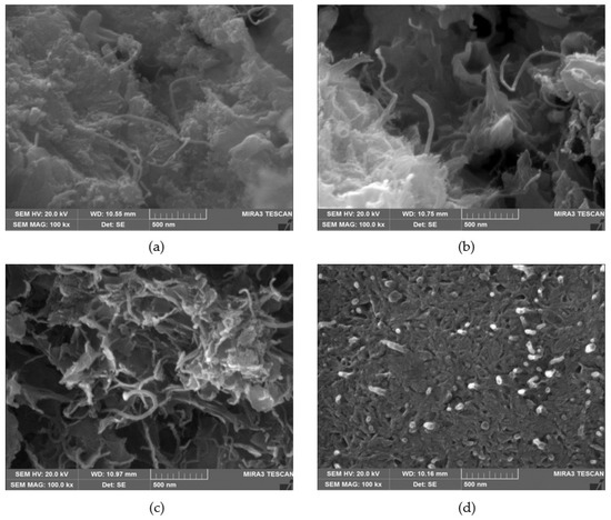 FE-SEM images of cement composites: (a) 0.25 wt.% MWCNT dispersion (×100,000), (b) 0.50 wt.% MWCNT dispersion (×100,000), (c) 0.75 wt.% MWCNT dispersion (×100,000), and (d) 0.75 wt.% MWCNT dispersion and MWCNT-coated film (×100,000).
