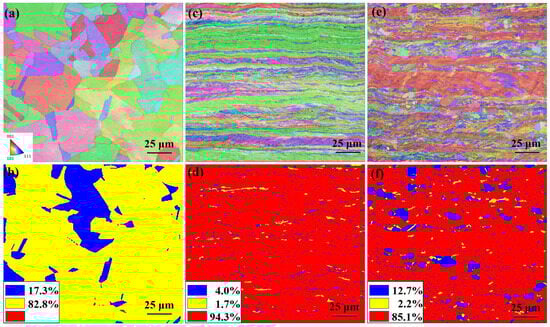 To further analyze the equiaxed grains in the sample with an asynchronous ratio of 1.2, grain orientation spread (GOS) was adopted to measure the local lattice distortion and recrystallization. The grains with GOS values of 0~1.5, 1.5~7, and 7~ were, respectively, identified as recrystallized grains (marked as blue), substructures (marked as yellow), and deformed grains (marked as red), as shown in Figure 1b,d,f. In the original sample, due to heat treatment, 82.8% of the grains were substructured and 17.3% of the grains were recrystallized grains. After rolling with asynchronous ratios of 1 and 1.2, deformed grains dominated, accounting for 94.3% and 85.1%, respectively, among which the substructures were not significantly different. It is worth noting that after rolling with an asynchronous ratio of 1.2, the recrystallized grains in the sample were much higher than those in the rolled sample with an asynchronous ratio of 1, increasing from 4.0% to 12.7%. This indicates that as the asynchronous ratio increases, the proportion of dynamic recovery and dynamic recrystallization increases. Finally, the bimodal grain structure shown in Figure 1e was generated, which might be due to the microstructural refinement caused by the difference in roll speed during the asynchronous rolling process [11,19,20].