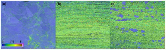 To provide a more intuitive reflection of the accumulation of local stress and the degree of microscopic plastic deformation in the material, Figure 2 presents the distribution of kernel average misorientation (KAM) under various processing conditions [21,22]. KAM values, derived from EBSD data, serve as a critical indicator of local misorientation within individual grains.