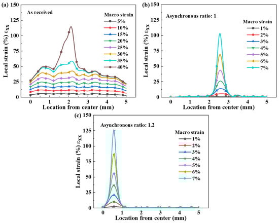 Local strain distribution along the tensile direction under different strain stages: samples (a) as-received, (b) with asynchronous ratio to 1, and (c) with asynchronous ratio to 1.2.