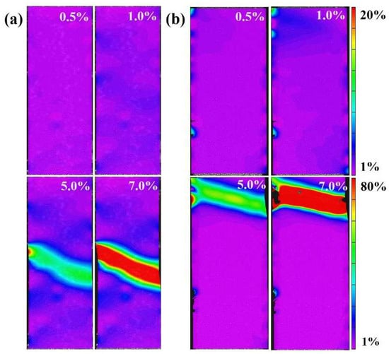 Figure 4 illustrates the local strain distribution of pure copper samples processed via asynchronous rolling under different levels of macro tensile deformation.