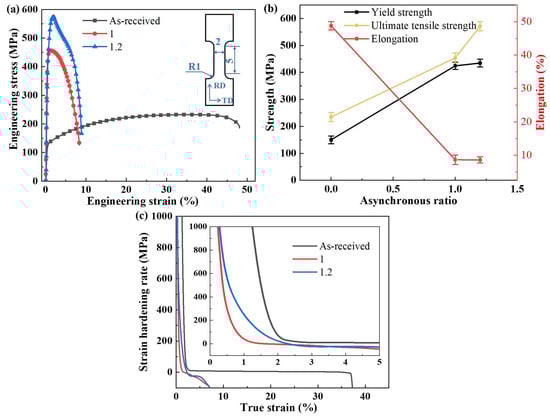 Tensile properties in different conditions: (a) engineering stress–strain curves under different asynchronous ratios and as-received, (b) variation in YS, UTS, and elongation with different asynchronous ratios, and (c) strain-hardening rate curves as a function of true stain.