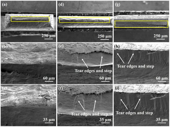 Fracture morphology in different conditions: (a–c) as-received sample, (d–f) asynchronous ratio to 1, and (g–i) asynchronous ratio to 1.2.