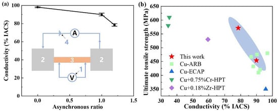 (a) Electrical conductivity of the samples at different asynchronous ratios; (b) electrical conductivity and strength [1,29,30,31].