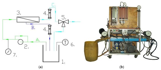 NF/RO pilot plant: (a) Scheme: 1—feed tank; 2—piston pump with by-pass; 3—tubular membrane module; 4—rotameters; 5—three-way cock; 6—electronic thermometer; 7—manometer; A—feed; B—retentate; C—permeate. (b) Photo of installation.