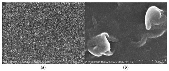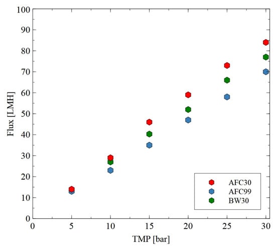 Hydrophilic thin-film composite membranes made from polyamide were used in the current study. These membranes are characterized by some differences in their structure, which have a significant impact on their performance [37]. To determine the water permeability of the membranes, the studies were performed using distilled water as a feed (Figure 2). The applied TMP was in the range from 5 to 30 bar. Obviously, the permeate flux increased linearly with the TMP for all membranes used. As indicated in [52], higher pressure led to more solvent being pushed towards the membrane surface and, consequently, at higher pressure, higher values of flux were noted. For instance, at the TMP of 30 bar, the flux was equal to 70, 77 and 84 LMH for the AFC30, BW30 and AFC99 membranes, respectively. It is important to note that the obtained results are consistent with the values provided by the membrane manufacturers [33,34,35,36]. The SEM observations confirmed that the AFC30 membrane is the most open membrane and is characterized by a more porous structure (Figure 3a). In contrast, the reverse osmosis membranes have a more compact active layer (Figure 3b), which increases flow resistance and consequently reduces permeate flux. Worthy of note is that similar values of water flux for the AFC30 membrane at the same TMP range were obtained in a previous study [40], wherein the treatment of effluents from a membrane bioreactor was investigated. Moreover, a slightly high performance of the AFC membrane was noted in a study [53] focused on the NF of highly concentrated salt solutions up to seawater salinity.