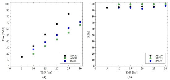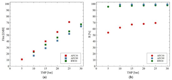 It was found that for each membrane type the presence of monovalent NaCl in the feed solution led to a decrease in the membrane performance (Figure 4). For instance, for the AFC30 membrane at TMP of 20 bar, the flux for pure water and NaCl solution was equal to 59 LMH and 55 LMH, respectively. Obviously, the noted reduction can be explained by the osmotic effect caused by the salt concentration, which affected the driving force for the flow through the membranes used. Such a phenomenon for the NF process has been obtained and discussed in several previously published papers, e.g., [54,55]. Importantly, based on the results, it can be seen that the increase in TMP led to an increase in the performance of all membranes tested. The noted NaCl rejection for the AFC30 membrane was equal to 60%, which is in line with the specification provided by the manufacturer [33]. The highest NaCl rejection efficiency was obtained for the AFC99 and BW30 membranes. Indeed, it was equal to almost 100%, which is promising for their application in both the desalination process and the separation of fermentation broths. The order in which R was noted is AFC99 > BW30 > AFC30. It is important to note that the NaCl retention for the AFC30 membranes increased strongly by increasing the TMP due to the increase in solvent flux. This finding is in good agreement with the experimental results presented in [23,53,56].