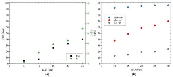 In the next step of the presented research, the impact of the TMP on the permeate flux and rejection coefficient for glycerol during the NF of the solution containing glycerol (0.5%) + citric acid (0.5%) + MgSO4 (0.2%) was studied. For this purpose, the AFC30 membrane was used. As demonstrated in Figure 6a, increasing TMP led to an increase in both the permeate flux and the rejection degree for glycerol. It is interesting to note that at TMP of 25 bar, the R was equal to 75%. However, most of the 1,3-PD passed through the membranes (Figure 6b). The salts and glycerol can be returned to the bioreactor and used as nutrients [46].