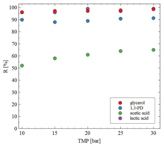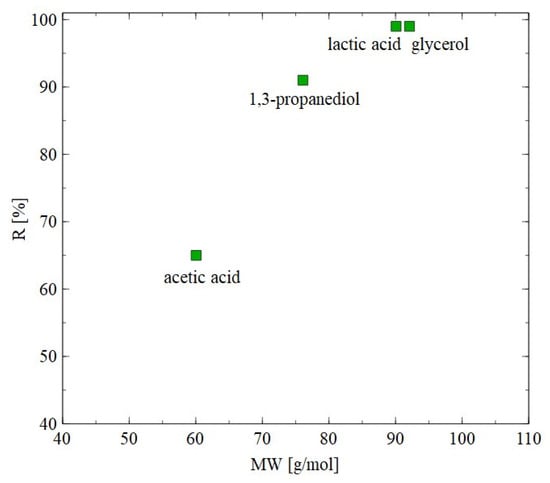 The AFC30 membranes retained most of the salts and organic acids while 1,3-PD was present in the permeate (Figure 4, Figure 5 and Figure 6). Since the obtained permeate is diluted, its concentration with the use of RO membranes is beneficial. In order to investigate the separation of synthetic 1,3-PD separation broth, the BW30 membrane was used. Figure 7 shows the retention degree for organic compounds present in the feed. First of all, it was found that regardless of the applied TMP, almost all lactic acid and glycerol was rejected by the membrane. Indeed, the noted R was in the range from 96 to 99%. A slightly lower R (about 90%) was recorded for 1,3-PD. Finally, the lowest R was observed for acetic acid; however, it slightly increased with TMP. Indeed, it was from 52 to 65% for TMP of 10 to 30 bar, respectively. Finally, it should be indicated that for the BW30 membrane, the order in which R was obtained was glycerol~lactic acid > 1,3-propanediol > acetic acid. This can be explained by the fact that the rejection efficiency increased with the molecular weight (Figure 8). This indicates that the separation mechanism with the use of the BW30 membrane was based mainly on the sieving effect. Hence, it can be indicated that the RO process makes it possible to concentrate the 1,3-PD solution, characterized by the presence of other organic components of fermentation broth.