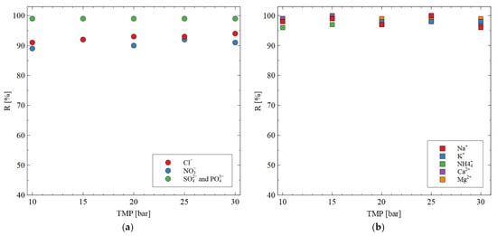 The AFC30 membranes did not retain all the salts present in the fermentation broth; hence, some of them were concentrated with the use of the RO membranes. The rejection efficiency as a function of TMP for ions present in the synthetic fermentation broth is shown in Figure 9. It was found that SO42− and PO43− are characterized by higher R than Cl− and NO3− ions. This can be explained by the fact that multivalent ions are characterized by a higher (i) charge density, (ii) hydrated radius, (iii) hydration energy and (iv) molecular weight (Table 2). This result indicated the significant role of both the sieving effect and Donnan exclusion during ion separation. With regard to cations, it important to note that for all applied TMPs, the R was higher than 95%. Hence, it can be concluded that the BW30 membrane has been proven to be successful in almost complete cation retention. Based on this finding, it can be assumed that since the pH solution was neutral, the membrane was negatively charged.