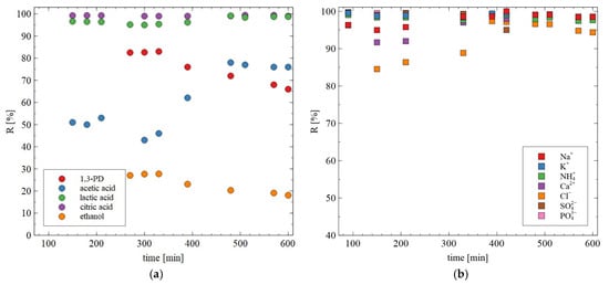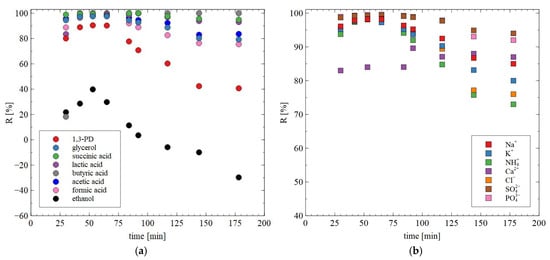 The obtained NF permeate was subjected to further separation using the BW30 membranes. The noted rejection degree for most solutes was in the range of 80–100% (Figure 14). On the other hand, a significant decrease in R was noted for 1,3-PD. Indeed, after 2 h of the process run it decreased to 40%. This result confirms the conclusion that the BW30 membranes allow permeate containing mainly 1,3-PD to be obtained. This finding significantly facilitates further purification methods, such as distillation or ion exchange.