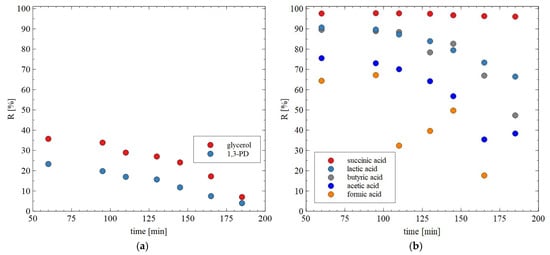 The effect of process time on the rejection efficiency for (a) glycerol and 1,3-PD; (b) organic acids during the NF of real fermentation broths. The AFC30 membrane.