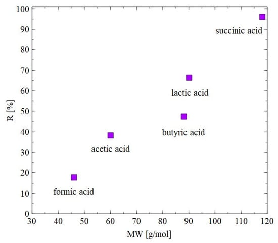 The results of separation of 1,3-PD fermentation broth with the application of the AFC30 membrane are shown in Figure 11. It has been demonstrated that during the first 60 min of the process run, the rejection degrees for glycerol and 1,3-PD were similar to those obtained for the model broth (Figure 6b). However, retention for 1,3-PD and glycerol decreased after 3 h from 20 to 5% and from 40 to 8%, respectively (Figure 11a). With respect to organic acid, a much higher rejection was noted, ranging from 20 to 97% (Figure 11b). It has been noted that the order in which separation performance was obtained as follows: succinic acid > lactic acid > butyric acid > acetic acid > formic acid. It can be assumed that since the feed pH (equal to 7) was higher than the acid pKa (Table 3), they dissociated into ionic forms, which significantly improved the separation efficiency of NF membranes. Nevertheless, it has been determined that the coefficient R is strongly dependent on the molecular weight (MW) (Figure 12). For instance, for succinic acid the coefficient R was constant during the NF process and equal to 97%. On the contrary, it was observed that the retention of formic acid in the end of the experiment was lower than 20%. Therefore, it can be concluded that organic acids present in the real fermentation broth were mainly retained by a sieving effect. Worthy of note is that a very similar rejection sequence was obtained by Kand and Chang [61], wherein the removal of organic acid salts from simulated fermentation broth was studied. More precisely, the above-mentioned authors demonstrated that the use of the NF45 membrane ensured the R in the following order: sodium succinate > sodium lactate > sodium acetate > sodium formate.