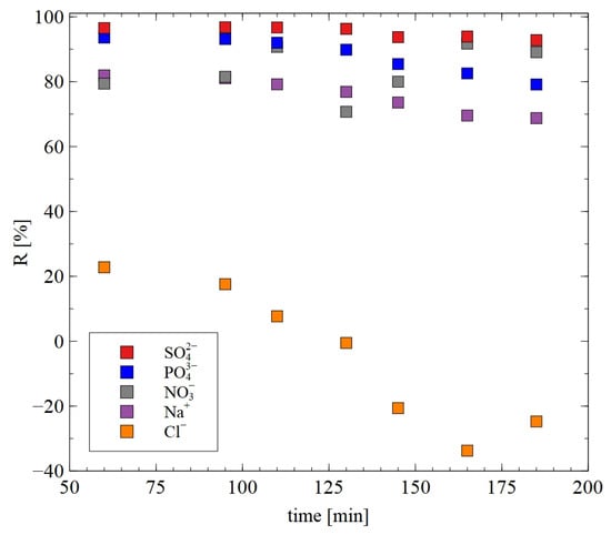 The rejection degree was calculated based on the components’ concentration in the feed and permeate. Liquid chromatography (HPLC) (organic compounds) and ion chromatography (inorganic compounds) were used for the analysis. The analytical methods were thoroughly described in previous studies [24,49,50,51].