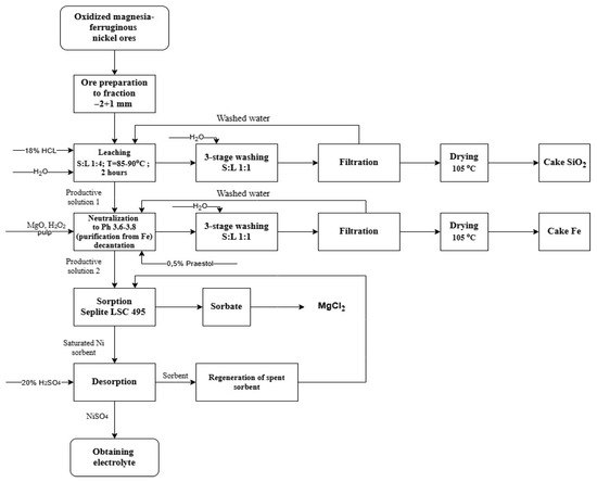 The following reagents were used for metallurgical nickel production processes. Oxidized magnesia—ferruginous nickel ores from the “Gornostayevskoye” deposit—were used as initial raw materials. Hydrochloric acid (37% HCl), supplied by JSC “Kaustik Company” (Pavlodar, Kazakhstan), was used as the leaching agent in the experiments. Sigma-Aldrich (St. Louis, MO, USA) is a manufacturer of hydrogen peroxide (H2O2, 37%) and magnesium oxide (MgO). The flocculant Praestol 2500 (Ashland Inc., Wilmington, DE, USA) was used without any pre-treatment. The ion exchange resin LSC495 (bispiolamine, Lanxess Deutschland GmbH, Cologne, Germany) was used in the sorption and desorption processes. Sulfuric acid (96% H2SO4, JSC “Base No. 1 of Chemical Reagents”, Moscow, Russia) was used in the desorption process. All experiments were conducted using distilled water.