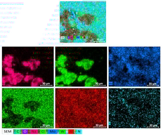 Table 2 clearly shows the increased concentration of chlorine and sodium in the dark spots, while the light regions exhibit higher concentrations of tungsten–molybdenum compounds. A more detailed elemental composition of a sample with a W/Mo ratio of 0.2 obtained from aqueous alcohol solutions is shown in Figure 3.