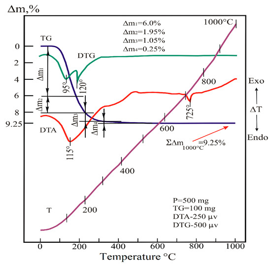 Thermal reactions occurring up to 500 °C were caused by the release of water molecules and hydroxyls partially bound to acid residues from the system. In the range of 20–200 °C, the main stage of dehydration occurred, which proceeds in two stages. The first stage (step, part) of dehydration (DTG peak is in the range of 95 °C) is carried out in the range of 20–140 °C. At the same time, the weight loss of the sample reaches 6%. The second stage (step) (DTG peak—in the vicinity of 120 °C) occurs in the range of 140–200 °C, where the mass of the sample decreases by another 1.95%.