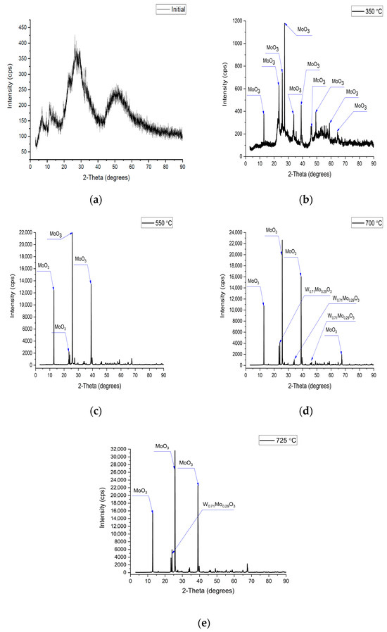 An increase in the intensity of the peak of the tungsten–molybdenum oxides phase is noticeable with an increase in the annealing temperature (Figure 6d,e). The crystallinity level in this case also increased from 77% (550 °C) to 96% (725 °C), and the parameters of the crystal lattice became approximately the same (Table 5). This indicates the formation of a stable structure of this phase after annealing at 700–725 °C.