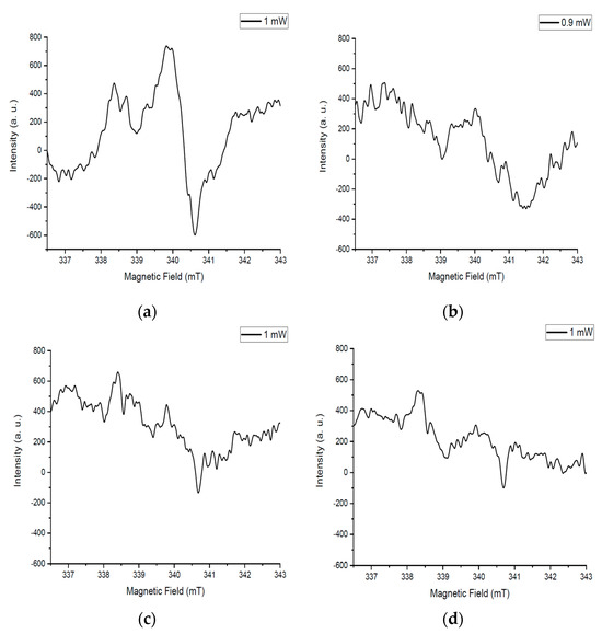 The following spectrum recording parameters made it possible to detect various signals with high accuracy. Reducing the amplitude of the modulation of the signal (0.4 mT) and the time constant (0.1 s) allows the system to manifest signals with low intensity. Accumulating the spectrum four times resulted in noise reduction by averaging.