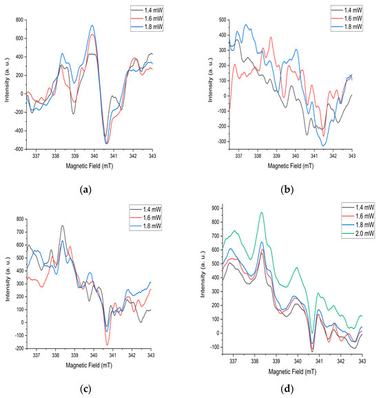 EPR signals from various paramagnetic particles manifest at different values of microwave radiation power. These values for Ni-MoO3-WO3 samples were from 0.2 to 2 mW. The constancy of the waveform with a sequential change in microwave radiation power during measurements indicates the stability of the structures after annealing at 725 °C (Figure 8d). Changes in the shape of the spectrum with an increase in power for other heat treatment modes also confirms this assumption (Figure 8a–c). This is closely related to the high level of crystallinity and energy stability of the substance after annealing at a temperature of 725 °C. There are several different interconnected signals in the spectrum. The diversity of the nature of signals is based on the difference in their shape in the spectrum. In this case, the relationship of the signals is determined by the same changes with successive increases in microwave power (Figure 8d).