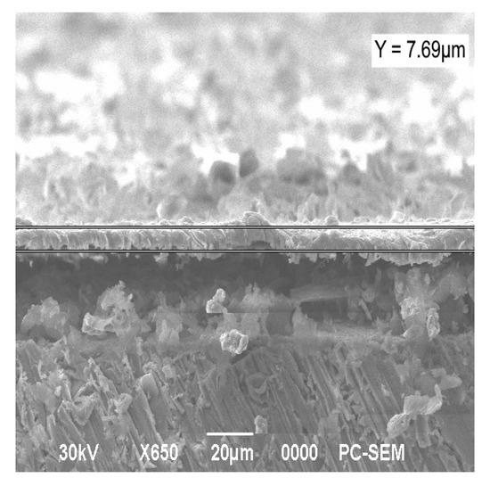 The formation of composite coatings on a metal substrate is aimed at improving the quality characteristics of the substance. Structures with high stability obtained as a result of synthesis and subsequent heat treatment were used to form electroplating coatings by electrolysis. In this case, nickel electrolytes with a dispersed phase of molybdenum oxide or co-precipitated oxides of molybdenum and tungsten were applied. The surface morphology of the deposited Ni-MoO3-WO3 coatings is shown in Figure 9. The average coating thickness (h) was calculated from ten SEM cross-sectional images of the sample, h = 6.61 ± 0.51 µm (Figure 10).