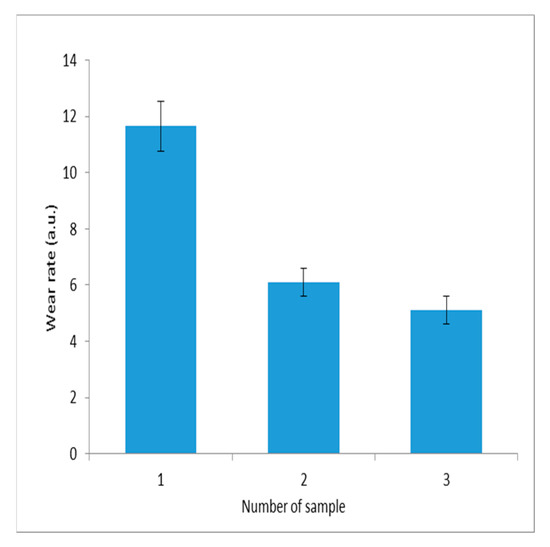 The wear values for the three samples are 11.65 ± 0.9 a.u., 6.1 ± 0.5 a.u., and 5.1 ± 0.5 a.u., respectively.