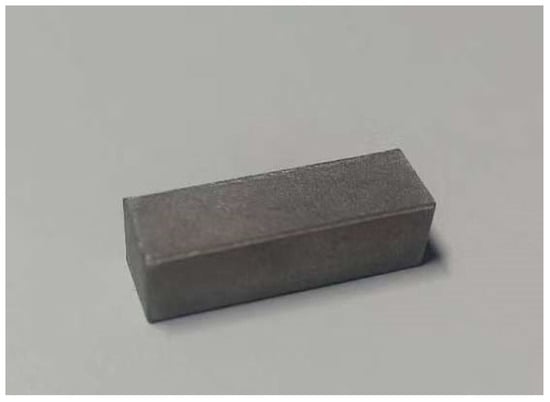 As detailed in Table 1, the experiments were conducted using a planetary ball mill at 420 r/min for 60 h of mixing and wet grinding to ensure that the powder ingredients were fully refined and uniformly mixed. The resulting slurry was dried in a vacuum drying oven for 24 h, followed by sieving and granulation to optimize powder flow. The forming process was carried out by unidirectional pressing, where the powder was pressed through a mold to fabricate a compact. At the sintering stage, the briquettes were placed in a low-pressure sintering furnace under an argon gas-protected atmosphere at three temperatures: 1410 °C, 1450 °C, and 1500 °C. The argon gas pressure was controlled at 5.0 MPa. The final standard bending-bar samples, as illustrated in Figure 1, were obtained as shown in Table 2, with dimensions of approximately 20 × 6.5 × 5.25 mm. The preparation process is illustrated in Figure 2.