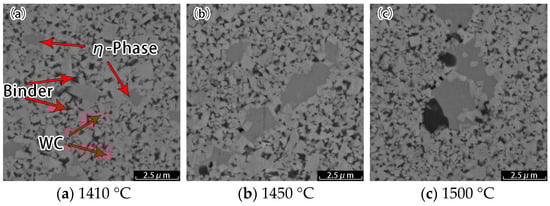 There exists a close correlation between the organizational properties of cemented carbide and the carbon content and sintering temperature. During the sintering process, the carbon content plays a dual role. On the one hand, it regulates the solubility of tungsten in the binder phase; on the other hand, it effectively inhibits the formation of the deleterious η-phase, thereby safeguarding the overall properties of the alloy [22]. Meanwhile, an increase in sintering temperature significantly enhances the densification of cemented carbide, which is one of the key factors to improve the performance of the alloy. However, excessively high sintering temperatures may trigger unfavorable phenomena such as abnormal grain growth and dimensional deformation, which may, on the contrary, cause damage to the alloy properties [23,24].