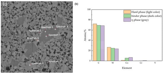 Figure 3 presents the microstructure photographs of the WC-10Co alloy following sintering at 1410 °C, 1450 °C, and 1500 °C under carbon-deficient conditions. In these images, the light-colored massive grains correspond to the WC hard phase, the dark black regions represent the bonded phase, and the grayish areas in between are identified as the η phase. To analyze the composition of these three phases, we conducted EDS tests at multiple points as illustrated in Figure 4a, with the detection results shown in Figure 4b. EDS analysis indicates a decreasing trend in C and W element contents across the light, dark, and gray phases, respectively, while Co element content exhibits an increasing trend. This distribution aligns with the phase composition characteristics of the hard phase, bonded phase, and η phase.