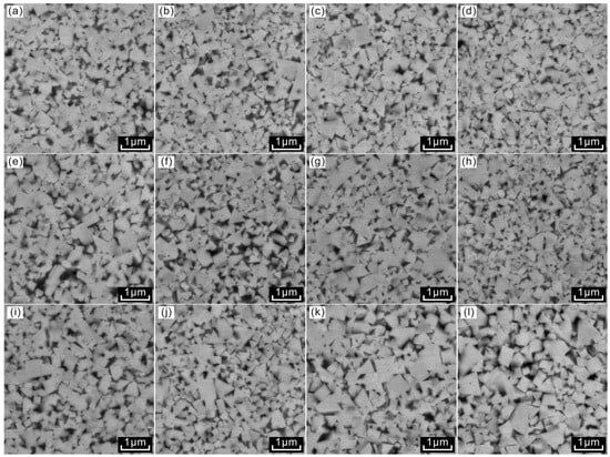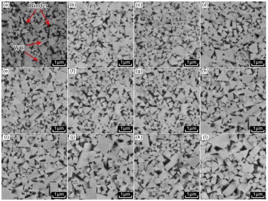 Microstructure of WC-10CoNiFe samples of Group B. (a) B-1-1410; (b) B-2-1410; (c) B-3-1410; (d) B-4-1410; (e) B-1-1450; (f) B-2-1450; (g) B-3-1450; (h) B-4-1450; (i) B-1-1500; (j) B-2-1500; (k) B-3-1500; (l) B-4-1500.