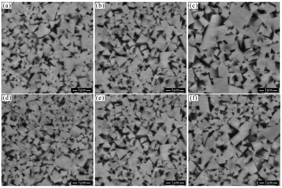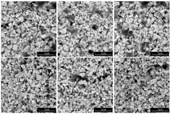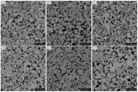 Fracture grain morphology of WC-10Co and WC-10CoNiFe samples for selected preparation conditions. (a) A-1-1410; (b) A-3-1410; (c) A-3-1450; (d) B-1-1410; (e) B-3-1410; (f) B-3-1450.