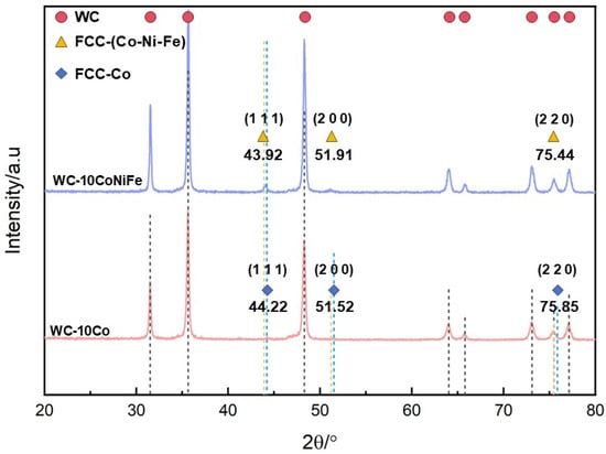 X-ray diffraction (XRD) analysis was conducted on WC-10Co and WC-10CoNiFe samples, with phase identification results shown in Figure 9. Comparison with ICDD PDF cards confirmed that both alloys are dominated by the WC hard phase (card no. 73-0471), whose diffraction peaks exhibit significantly higher intensity than the binder phase. The binder phase in WC-10Co is identified as face-centered cubic cobalt (Fcc-Co, card no. 15-0806), while the WC-10CoNiFe alloy forms a (Co-Ni-Fe) solid solution (card no. 12-0736). The dominant peaks of the (Co-Ni-Fe) solid solution correspond to the (111), (200), and (220) crystal planes, consistent with Fcc-Co structure. This suggests that the (Co-Ni-Fe) solid solution retains an Fcc structure. Calculations yield lattice constants of 2.876 Å for Co and 2.880 Å for the (Co-Ni-Fe) solid solution, indicating minimal structural impact from Ni/Fe addition. Notably, the WC diffraction peaks in WC-10CoNiFe are significantly stronger than those in WC-10Co, which correlates with the binder phase’s capacity to solubilize tungsten. Under identical preparation conditions, the synergistic solubilization effect of Ni-Fe in the (Co-Ni-Fe) solid solution effectively suppresses the dissolution–precipitation of WC phase, retaining more tungsten atoms within the hard-phase lattice and thereby enhancing WC peak intensity. No secondary phases such as η-phase or graphite were detected, demonstrating that the experimental design and processing parameters avoided phase imperfections in the alloys.