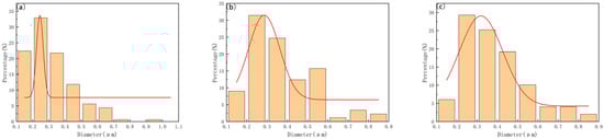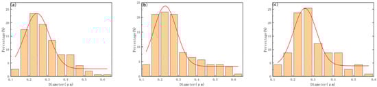 Distribution of grain sizes in WC-10CoNiFe samples sintered at different temperatures with gaussian fit 1410 °C (a), 1450 °C (b), and 1500 °C (c).