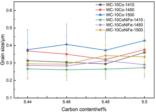 In the preceding ball-milling process, the raw material grains were refined, and the ultrafine WC crystals were inherently fine. The dissolved–precipitated WC grains during sintering were even coarser than those prior to sintering. However, the increase in carbon content reduces the solubility of WC in the binder phase and impedes the dissolved–precipitated behavior of the grains within the same sintering duration. Therefore, the increase in carbon content within a certain range results in a decrease in the grain size of the final alloy.
