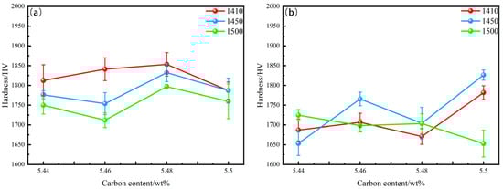 The relationship between microhardness and carbon content in Group A and Group B alloys. (a) WC-10Co; (b) WC-10CoNiFe.