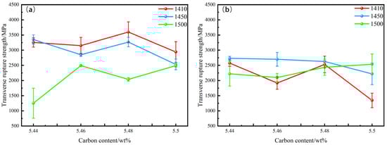 The relationship between transverse rupture strength and carbon content in Group A and Group B alloys. (a) WC-10Co; (b) WC-10CoNiFe.