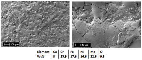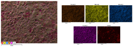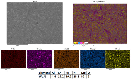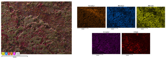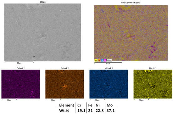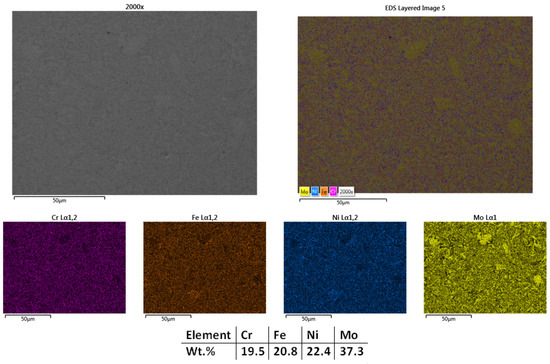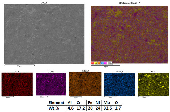 The mapping analyses and EDS results (Figure 6) present a uniform elemental distribution over the analyzed area, but there are still Mo, Cr, and Ni particles with incomplete diffusion within the matrix. The EDS analysis revealed that the sample contains oxygen in the detection range of the equipment. The presence of oxygen could be justified by the in-air powder weighing and manipulation for die assembly preparation.