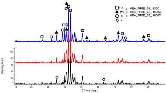 For CrFeNiMo HEA sintered at 950 °C (HEA-FREE-S1-950C), the presence of a minor orthorhombic (O) phase was identified at the 2θ angular position of 35.13° and 64.39° with an abundance of CrMoNi, this phase being a hardening phase.