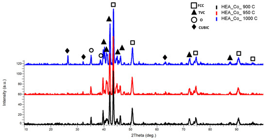 The XRD comparative analysis result (Figure 9) shows that all major peaks are concentrated in the area of maximum intensity, behavior noted at the CrFeNiMo HEA as well, with the highest intensity peak identified at the 2θ angular positions of 43.5°, with an FCC major phase, with an abundance of FeNi and CrNi, and a secondary peak with a TVC phase at the 2θ angular position of 42.2°, having an abundance of CrFe and FeMo. A minor cubic phase was identified at the 2θ angular positions of 26.42°, 32.05°, and 63.08° with an abundance of FeCo and MoCo, where the MoCo combination was only identified for the sample sintered at 1000 °C. It was observed the presence of simple cubic phases at 1000 °C, being related to the temperature increment of 50 °C, indicating the continuous alloying degree improvement. The lattice distortion appears to be present in the current case too, since the BCC phase was not identified.