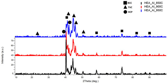 XRD comparative analysis results for the Al0.5CrFeNiMo HEA sintered at 850 °C, 900 °C, and 950 °C.