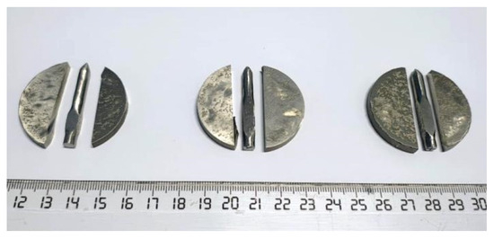 For the experimentation, the CrFeNiMo, Co0.5CrFeNiMo, and Al0.5CrFeNiMo HEAs sintered (diameter 40 mm and height 6 mm), cut, and machined into electrodes were used for the coatings production. To produce the electrodes, the median area of the samples was selected to maximize the electrode length as presented in Figure 14. The electrode’s shape was adjusted based on coating background with the electrospark deposition method [59,60].
