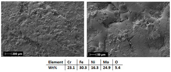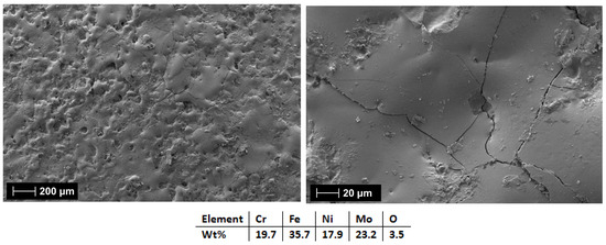 The microstructural results for the sample sintered at 950 °C (Figure 7) indicated that the structure was further refined and no defects were observed, while temperature increment had a notable impact on the samples. Elemental mapping results presented an improved elemental distribution over the analyzed area, with incomplete Cr and Mo sintering but with complete Ni sintering. Similar to the sample sintered at 900 °C, the presence of oxygen was noted. Based on the results, it was decided to increase the sintering temperature by 50 °C for further refining the structure.
