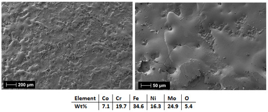 The surface microstructural analyses results presented in Figure 2 reveal a compact structure with low porosity and no visible defects, indicating that a high degree of sintering was achieved in most regions; however, some areas exhibited minor heterogeneity in particle bonding. The elemental mapping analyses results indicate sufficient microstructural refinement, where molybdenum-rich particles are not fully bound to the alloy matrix. The EDS analyses results confirm the elemental composition, with no contamination and with the elemental concentration close to the theoretical one. Although the carbon contamination and oxidation were taken into consideration, the content is under the detection limit of the used equipment.