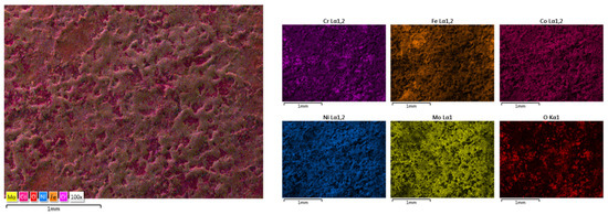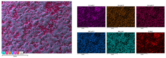 It was observed that the most promising results were obtained for the sample HEA-Co-S3-1000 (Figure 8), which was sintered at 1000 °C. There are no visible pores and no areas with incomplete sintering. As for the other samples, no cracks were observed and no other structural defects. The elemental mapping results present an advanced sintering level for molybdenum and a complete sintering of the other elements. It was also noticed a high degree of homogenization and elemental distribution. From the EDS analysis, the composition is confirmed and close to the theoretical calculations, with no impurities and low oxidation.