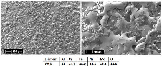 As for the Co0.5CrFeNiMo sintered HEA, oxygen was detected in the EDS analysis. Al tends to form Al oxides, which could indicate an increased corrosion resistance but also higher hardness in the final product.