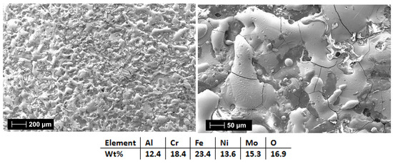 When sintered at 900 °C, a sintering improvement in terms of diffusion of the chemical elements within the matrix was observed, but it was not considered sufficient to withstand the forces that intervene during the mechanical processing into electrospark deposition electrodes or during the deposition process when the electrode is used as a functional part. The risk of electrode breaking during the deposition was taken into consideration, so it was decided to go further with a higher sintering temperature. The microstructure (Figure 11) revealed that the sample sintered at 900 °C was also not compacted sufficiently, but an improvement was observed when compared to the sample sintered at 850 °C. In Figure 11, the mapping and EDS analysis results are presented. Mo and Cr were not sintered completely, but an improvement was observed for Al and Cr sintering degrees when compared to the sample sintered at 850 °C. The temperature increment modified the microstructure and refined it, but it was not considered to be sufficient.