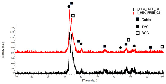 The crystallographic phases for the HEA coatings were identified by using the ICDD PDF 2 Release 2022 database, where the structures were similar to the following indexed files: PDF 01-071-7542—(Cr11Fe13Ni3)Mo3, PDF 03-065-8992—Cr6Fe18Mo5, PDF 01-071-7597—Cr0.8Ni0.2, PDF 01-085-1410—Fe, PDF 01-071-9765—MoNi4, PDF 03-065-7277—Fe0.875Mo0.125, PDF 01-071-7568—Cr0.5Mo0.5 for HEA-FREE-C1/HEA-FREE-C2, PDF 01-071-9764—Mo1.08Ni2.92, PDF 01-071-7597—Cr0.8Ni0.2, PDF 01-077-7598—CrFe, PDF 03-065-7519—CoFe15.7, PDF 01-081-4998—Cr0.8Mo0.4Ni0.8, PDF 01-087-7825—Mo0.11Cr0.26Fe0.63, PDF 01-073-9565—Cr for HEA-Co-C1/HEA-Co-C2, PDF 03-065-7277—Fe0.875Mo0.125, PDF 01-077-6757—(AlFe3)0.5, PDF 03-065-8992—Cr6Fe18Mo5, PDF 01-077-7958—Fe0.86Mo0.14, PDF 03-065-5131—Fe3Ni2, and PDF 00-051-0637—Cr7Ni3 for HEA-Al-C1/HEA-Al-C2.