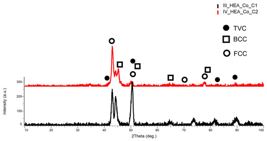 Important differences were observed when analyzing the HEA-Co-C1/HEA-Co-C2 coatings by XRD. When the identification was performed, a switch of maximum intensity was noticed, while for HEA-Co-C1, the highest intensity was at the 2θ angular position of 50.5° with a major FCC, BCC, and TVC phase with an abundance of MoNi, CrFeMo, CrFe, and CrNi, but also CoMoFe, while for HEA-Co-C2 coating, the highest intensity was at the 2θ angular position of 42.11° with a major FCC phase abundant in MoNi. Although the secondary peaks presented a high intensity for HEA-Co-C1, for the principal peak and all the mixture elements were identified also by EDS, the alloying process during all steps was confirmed. From the analyzed coatings, it was observed that the BCC and FCC phases were present as major phases together with a lattice deformation indicated by the TVC phase.