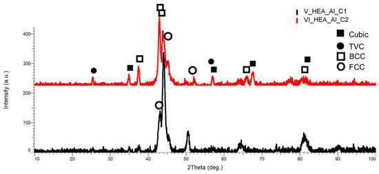 This observation is correlated to the microstructures presented in Figure 23, where cracks were present on the coating surface for HEA-Al-C2. The lattice deformation is noted for the HEA-Al-C1/HEA-Al-C2 due to the presence of the cubic and TVC phases, which present an abundance of CrFeMo and CrNi.