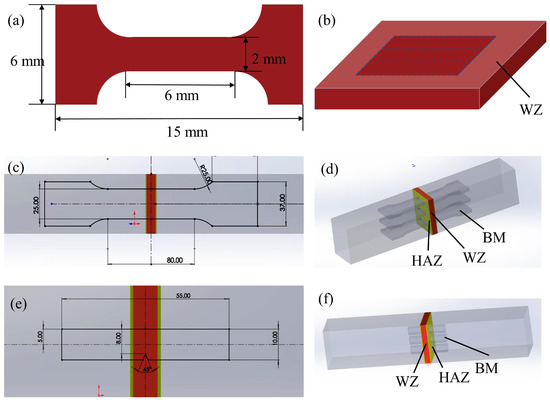 (a,b) Schematic diagram of small-sized tensile specimens and sampling locations within the WZ. (c,d) Schematic diagram of large-sized tensile specimens with reference to GB/T 2651-2023 of the Chinese National Standard [31] and sampling locations for the entire welded joint, and (e,f) schematic diagram of low-temperature impact specimens with reference to GB/T 2650-2022 [32] and sampling locations for the entire welded joint.